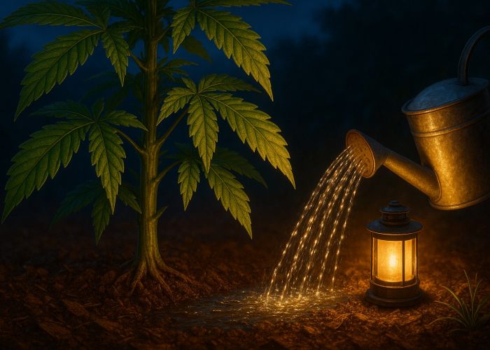 Если залить субстрат в такой момент, особенно в плотной или плохо дренированной почве, вода останется на месте. Она не пойдет в листья, а будет скапливаться у корней, вытесняя кислород и создавая застоявшуюся влажность. А в фазе цветения — когда растение наиболее уязвимо к внешним факторам — это может стать катализатором для развития грибков и гнили. Именно поэтому ночной полив, несмотря на видимую логику, требует очень аккуратного подхода, особенно если речь идет о каннабисе в открытом грунте.